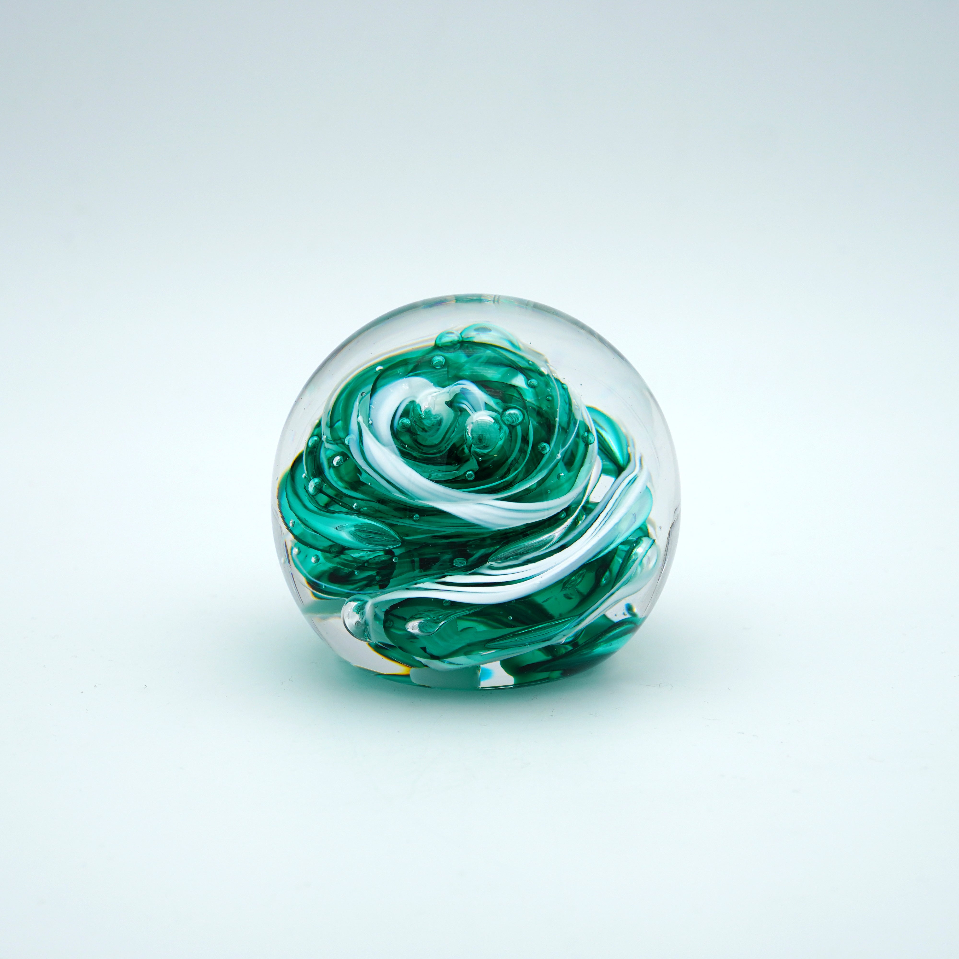Ce presse-papier en verre soufflé est notre création la plus plébiscitée : un objet unique, lumineux, façonné à la main, qui capte la lumière et les regards.